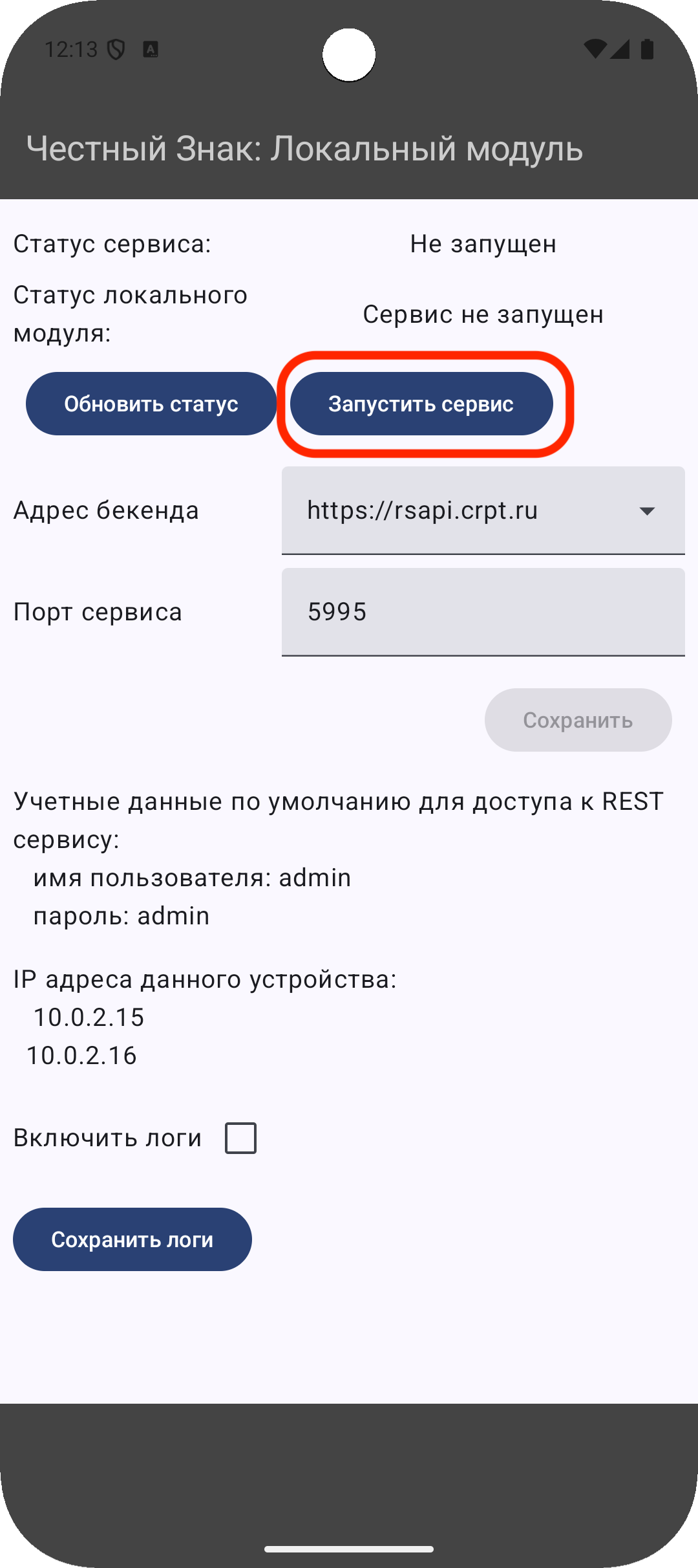 Убедитесь, что настройки модуля оставлены без изменений: адрес бекенда — https://rsapi.crpt.ru, порт сервиса — 5995.